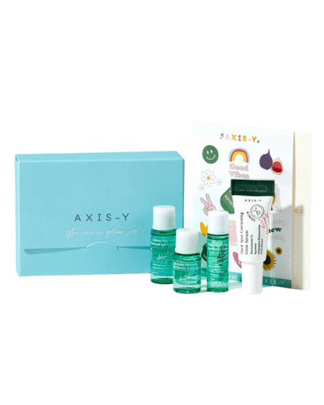Este Mini Glow Set es ideal para regalar y/o probar, Incluye cuatro minis de cuidado de la piel, pegatinas* enfocado en el cuidado de la piel.